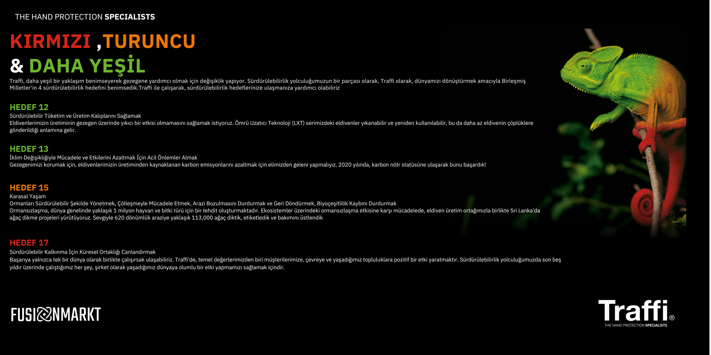 Traffi, güvenlik eldivenleri sektöründe sürdürülebilirliği merkeze alan inovatif çözümleriyle, operasyonel süreçlerini çevre dostu yaklaşımlar çerçevesinde şekillendirmektedir. İş güvenliği eldivenleri, LXT serisi ve tek kullanımlık eldivenler alanında uzmanlaşan Traffi, 2020 yılında karbon nötr olma hedefini gerçekleştirerek sektörde bir ilk olmuştur. İş süreçlerinde Sürdürülebilirlik Bilim Temelli Hedefler Girişimi (SBTi) ile uyumlu çalışarak karbon ayak izini minimize etme konusunda liderlik yapmaktadır.
